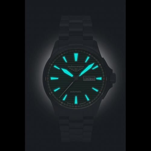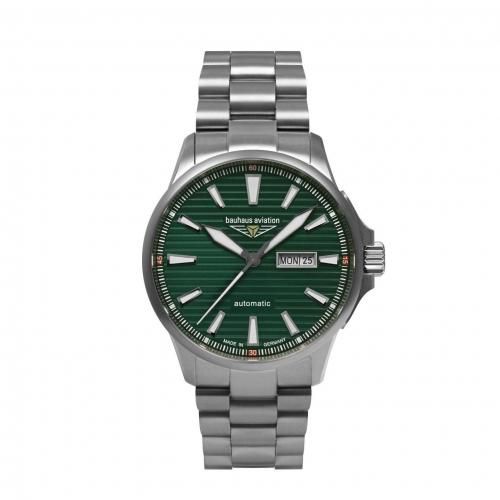 日本でも人気の高いZEPPELIN(ツェッペリン)、JUNKERS(ユンカース)、IRON ANNIE(アイアンアニー)などの数々のブランドを創設しているドイツ腕時計の老舗ポインテック社が、2019年にリリースしたブランドBAUHAUS(バウハウス)。バウハウス理念”Form follows function”を基に、過度な装飾を排除したシンプルで機能的な美しさを象徴する”洗練されたデザイン”の腕時計です。 シンプルを追求するほど本当に難しく、デザイン性が要求されると言われている中、バウハウスとパイロットウォッチのデザインを融合させたワンランク上の新悦モデル「Bauhaus Aviation / バウハウス アビエーション」が完成しました。 ”Bauhaus Aviation 2862M-4AT”は、チタン製の自動巻き腕時計。3時方向にデイデイトカレンダーを採用。グリーンの文字盤には、細かな平行線を連ねるギョーシェ加工の伝統的なデザイン「リズレ」が施され、光の反射を抑えて視認性を高める実用性と、複雑で美しい見た目を兼ね備えています。 また、非常に視認性が高いバトンインデックスを採用し、特にインデックスがルミブライトで満たされている場合、低光量の環境でも読みやすく、視認性が最適化されています。スポーティーで魅惑的な外観を醸し出した、流通限定の稀少なアナログパイロットウォッチです。 --- バウハウスとは --- 1919年から14年間、工芸、写真、デザイン、美術、建築など総合的な教育を行っていた美術学校です。その歴史は短いながら、功績は大きく、モダンデザインの基礎を作り、今もなお世界中の建築やデザインなど、あらゆる分野に計り知れない影響を及ぼしています。現在では様々なバウハウスデザインの時計が開発・発売されていますが、バウハウスのライセンスを正式に取得し「bauhaus」の名を名前にしたブランドはポインテック社のみです。