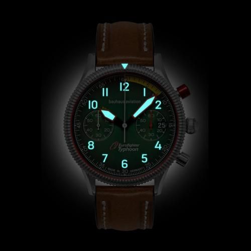 日本でも人気の高いZEPPELIN(ツェッペリン)、JUNKERS(ユンカース)、IRON ANNIE(アイアンアニー)などの数々のブランドを創設しているドイツ腕時計の老舗ポインテック社が、2019年にリリースしたブランドBAUHAUS(バウハウス)。バウハウス理念”Form follows function”を基に、過度な装飾を排除したシンプルで機能的な美しさを象徴する”洗練されたデザイン”の腕時計です。 シンプルを追求するほど本当に難しく、デザイン性が要求されると言われている中、バウハウスとパイロットウォッチのデザインを融合させたワンランク上の新悦モデル「Bauhaus Aviation / バウハウス アビエーション」が完成しました。 2576-4QZは、イギリス、ドイツ、イタリア、スペインのヨーロッパ4か国が共同開発したユーロファイター・タイフーンをモチーフにした2つ目のクォーツ・クロノグラフ腕時計。高精度な日本製クォーツムーブメントを搭載。3時方向のスモールセコンド内にデイトカレンダーをさりげなく採用。イエローとレッドのアクセントが映えるグリーンのサンレイダイヤルにホワイトの針と目盛りがモダンさを引き立たせています。また、ベゼルに「コインエッジ」を施し、光の反射を抑えてダイヤル内の刻時をより鮮明に見せる手法がクラシカル感を高めています。 左カウンターに「FL350/M1.5」、8秒位置に「Take off 8Sec」と記載され、ユーロファイターのフライトレベルやがブレーキオフから離昇までの所要時間8秒以内を表示するなど遊び心満載。6時方向と裏蓋にはロゴマークやトーネード戦闘機のイラストを刻印。ベージュのステッチを施したハンドメイドのレザーベルトを装着した、スポーティーで魅惑的な外観を醸し出したファッショナブルな男性用アナログパイロットウォッチです。 --- バウハウスとは --- 1919年から14年間、工芸、写真、デザイン、美術、建築など総合的な教育を行っていた美術学校です。その歴史は短いながら、功績は大きく、モダンデザインの基礎を作り、今もなお世界中の建築やデザインなど、あらゆる分野に計り知れない影響を及ぼしています。現在では様々なバウハウスデザインの時計が開発・発売されていますが、バウハウスのライセンスを正式に取得し「bauhaus」の名を名前にしたブランドはポインテック社のみです。